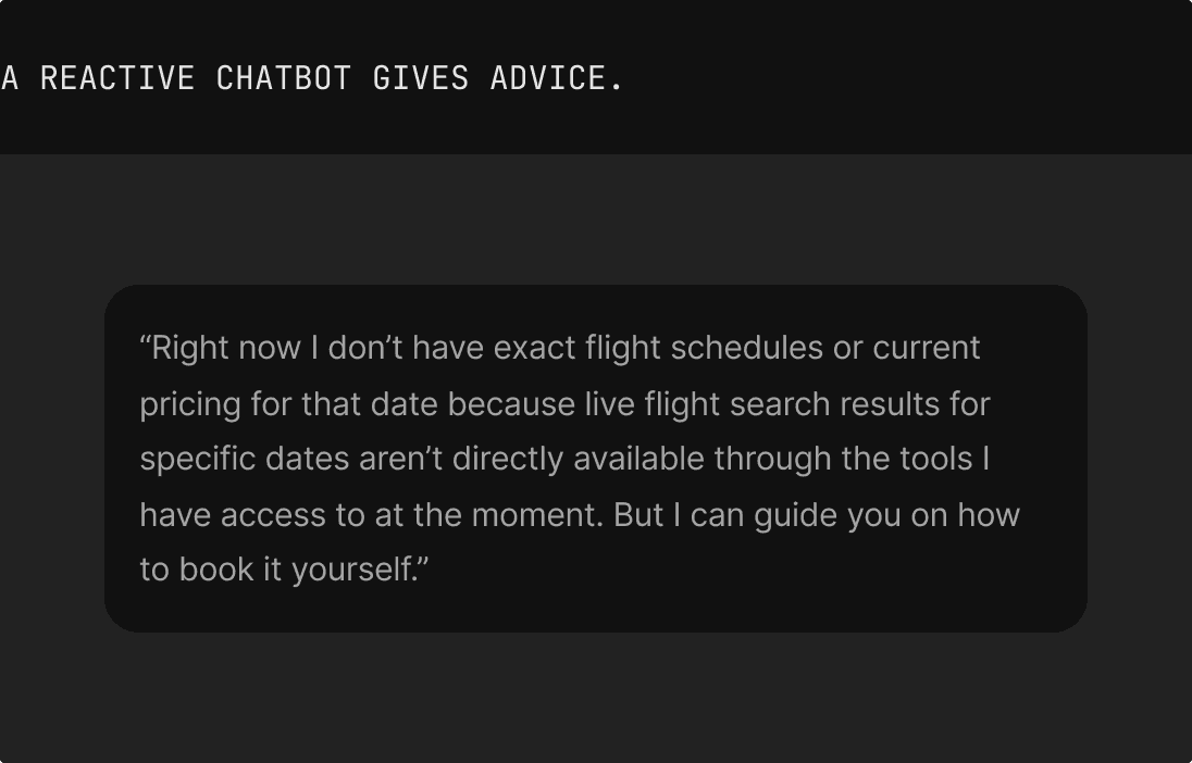 An AI agent is goal-driven: You give it an objective and constraints. It figures out what to do next, in what order, and how to recover when something goes wrong.