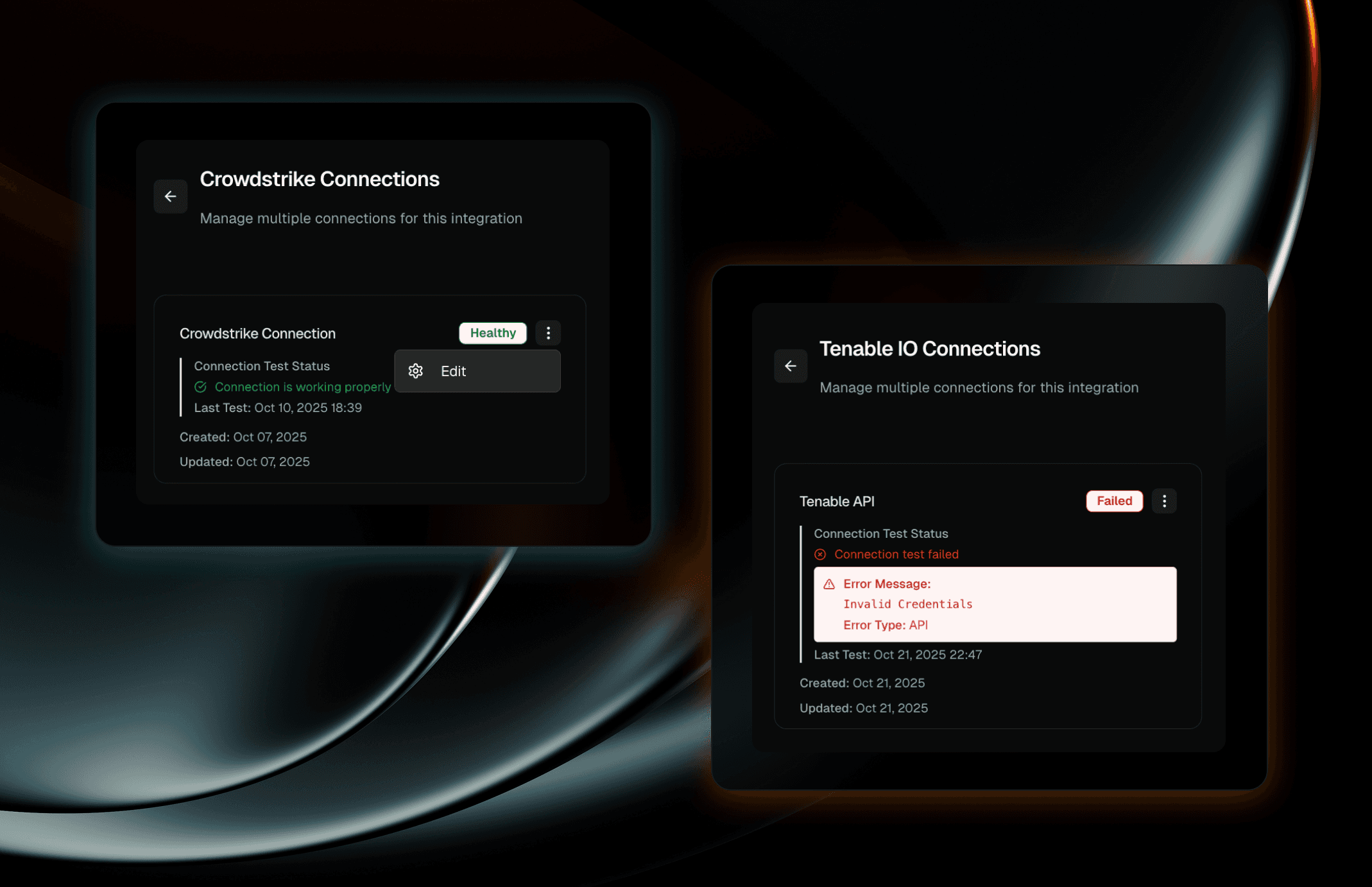 You now have full visibility into the status of every security tool connection right on screen. You can see connection health at a glance and track credential expiration dates.