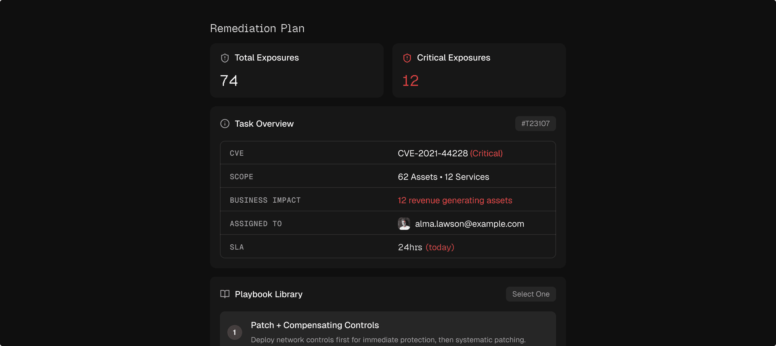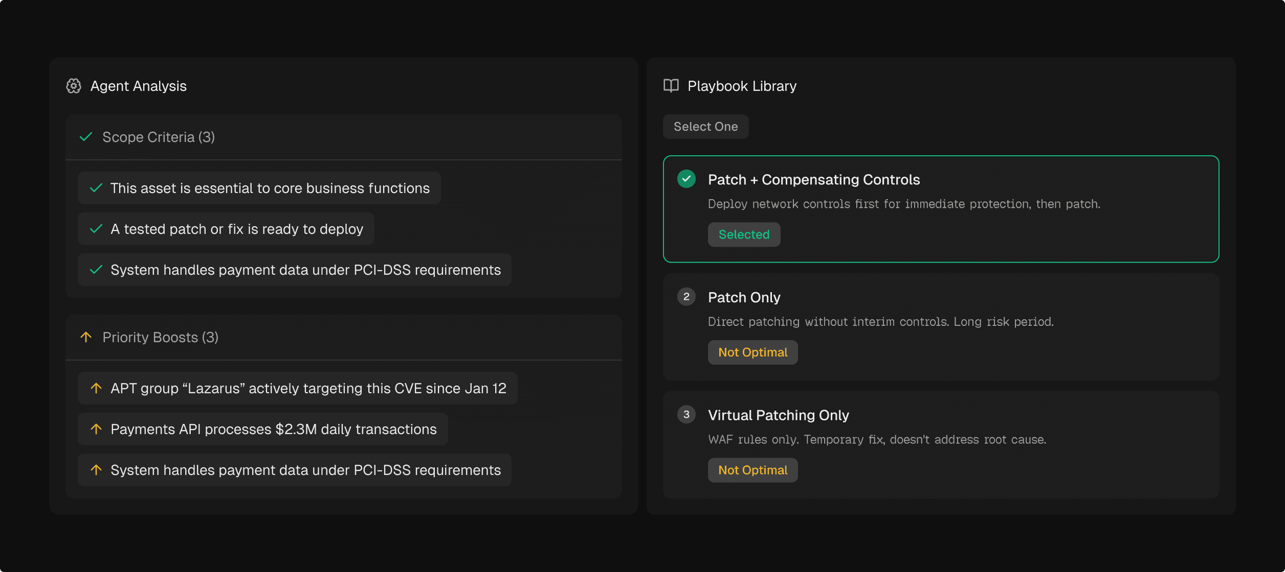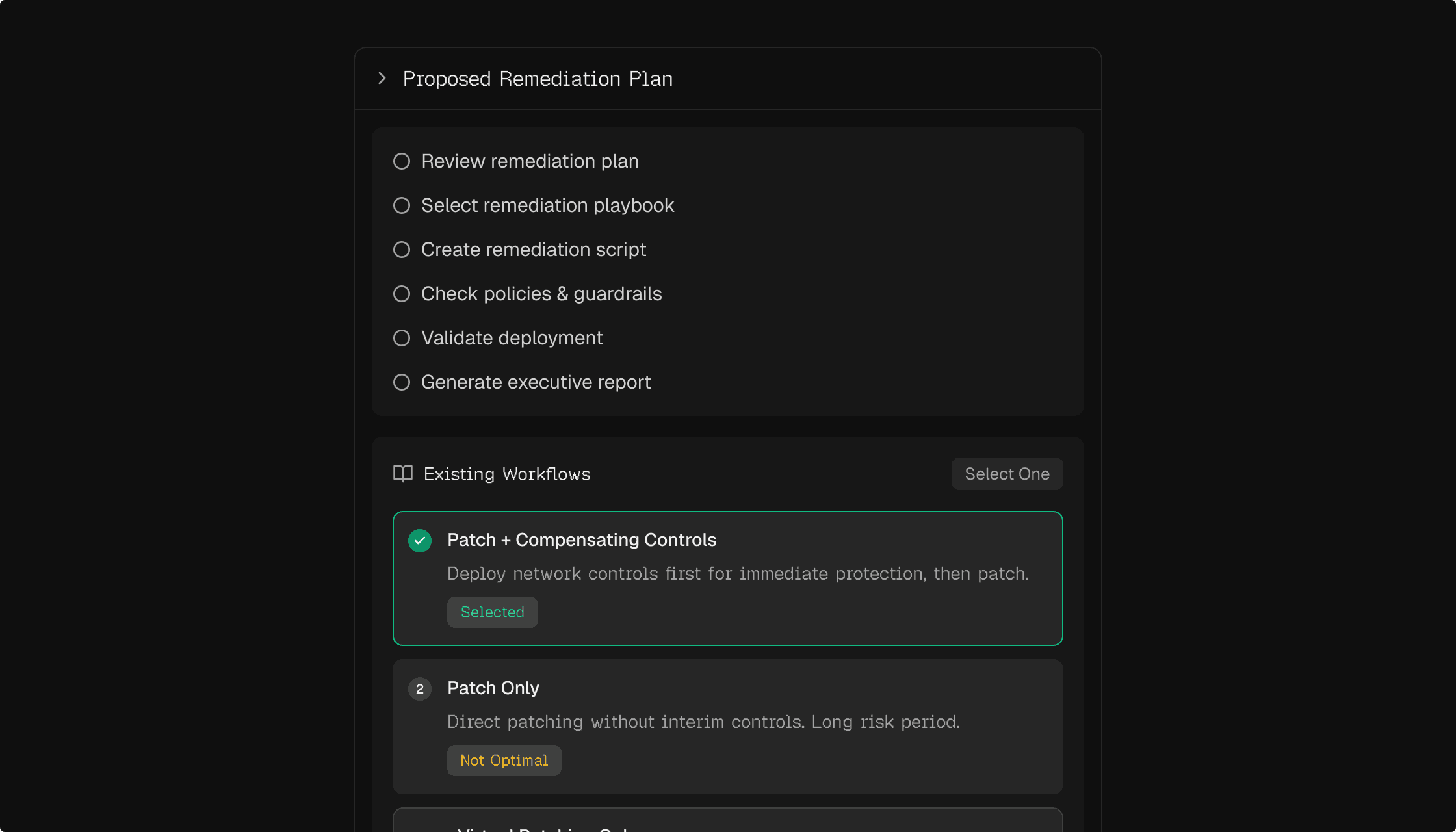 Generic "apply this patch" guidance gets ignored. Cogent generates remediation plans grounded in your specific environment, architecture, and operational reality.