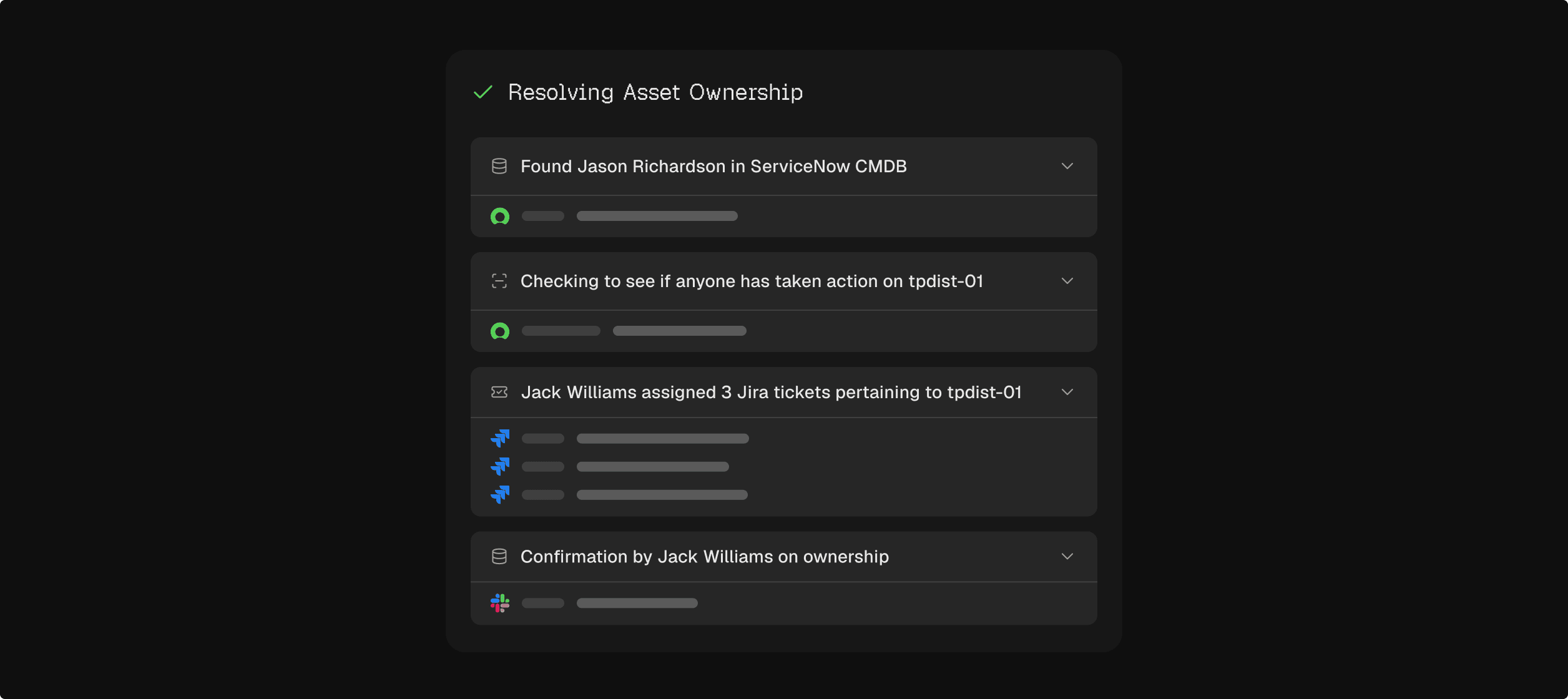 Pulls ownership signals from CMDBs, code repositories, infrastructure tools,and collaboration systems. Reconciles conflicts when sources disagree.
