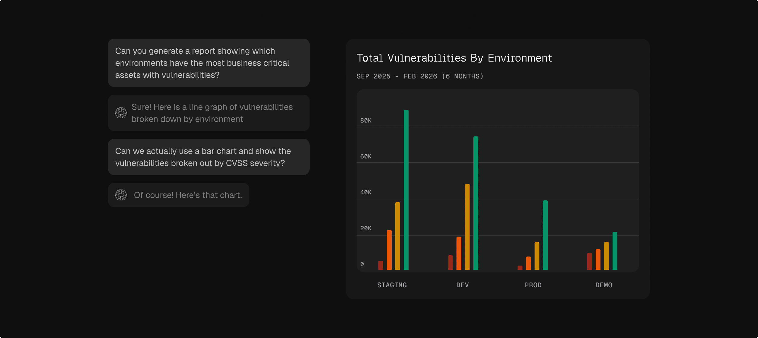 Ask questions in plain English: "Show me critical vulnerabilities by business unit over the last quarter." Cogent generates charts you can review on demand or download for presentations.