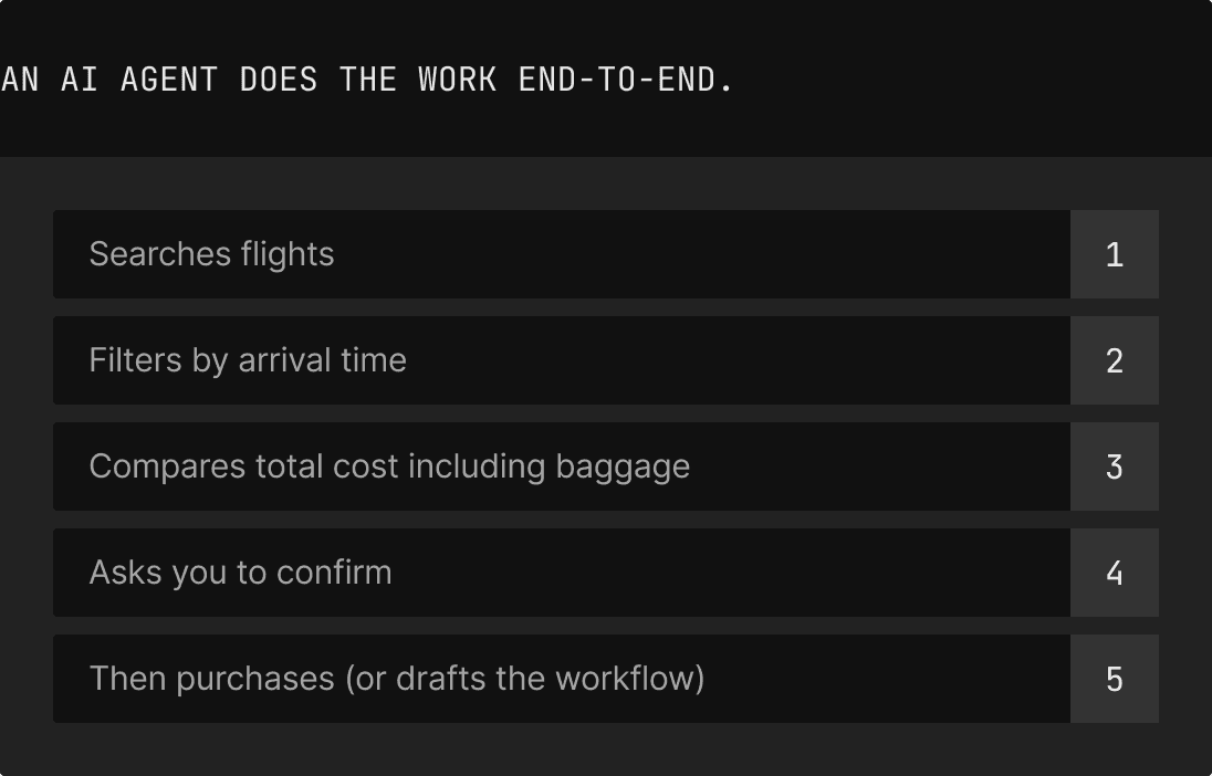 An AI agent is goal-driven: You give it an objective and constraints. It figures out what to do next, in what order, and how to recover when something goes wrong.