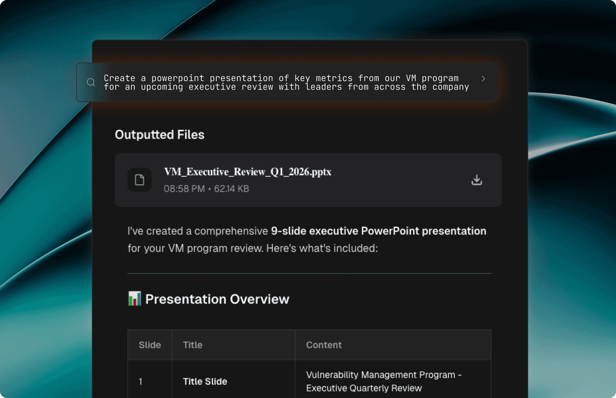 The General Agent can now produce polished PowerPoint reports directly from your data. Ask it to build a summary of your remediation progress or break down open vulnerabilities by severity, and it will generate a deck you can hand to your CISO or drop into a board packet.