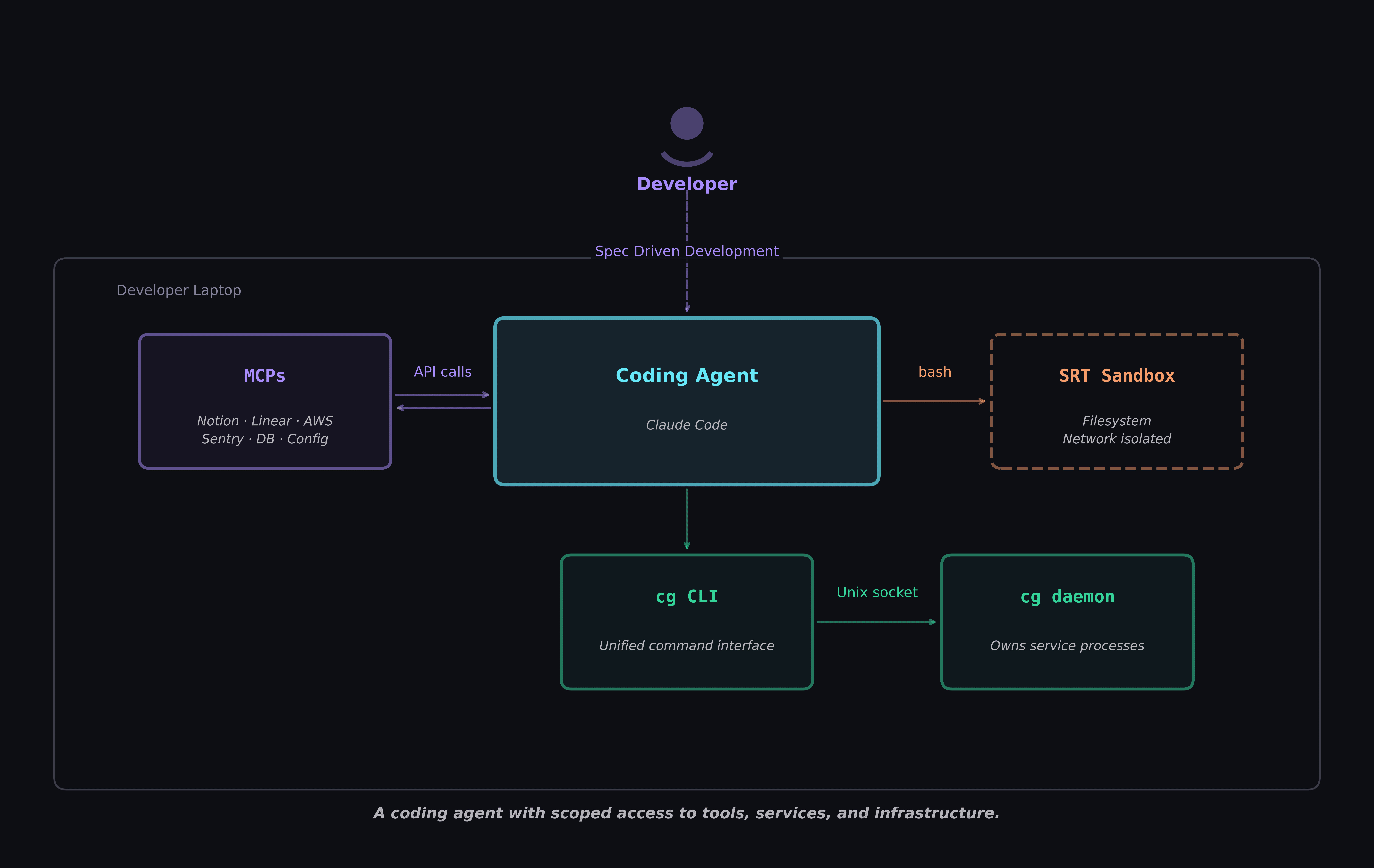 Every agent session runs in Sandbox Runtime (SRT) — OS-level process isolation via sandbox-exec (macOS) or Bubblewrap (Linux). Filesystem and network access are restricted to what you explicitly allow — nothing more. The cg daemon bridges the gap through a controlled Unix socket, exposing only what the agent needs: service lifecycle commands, AWS auth flows, database queries against read replicas.