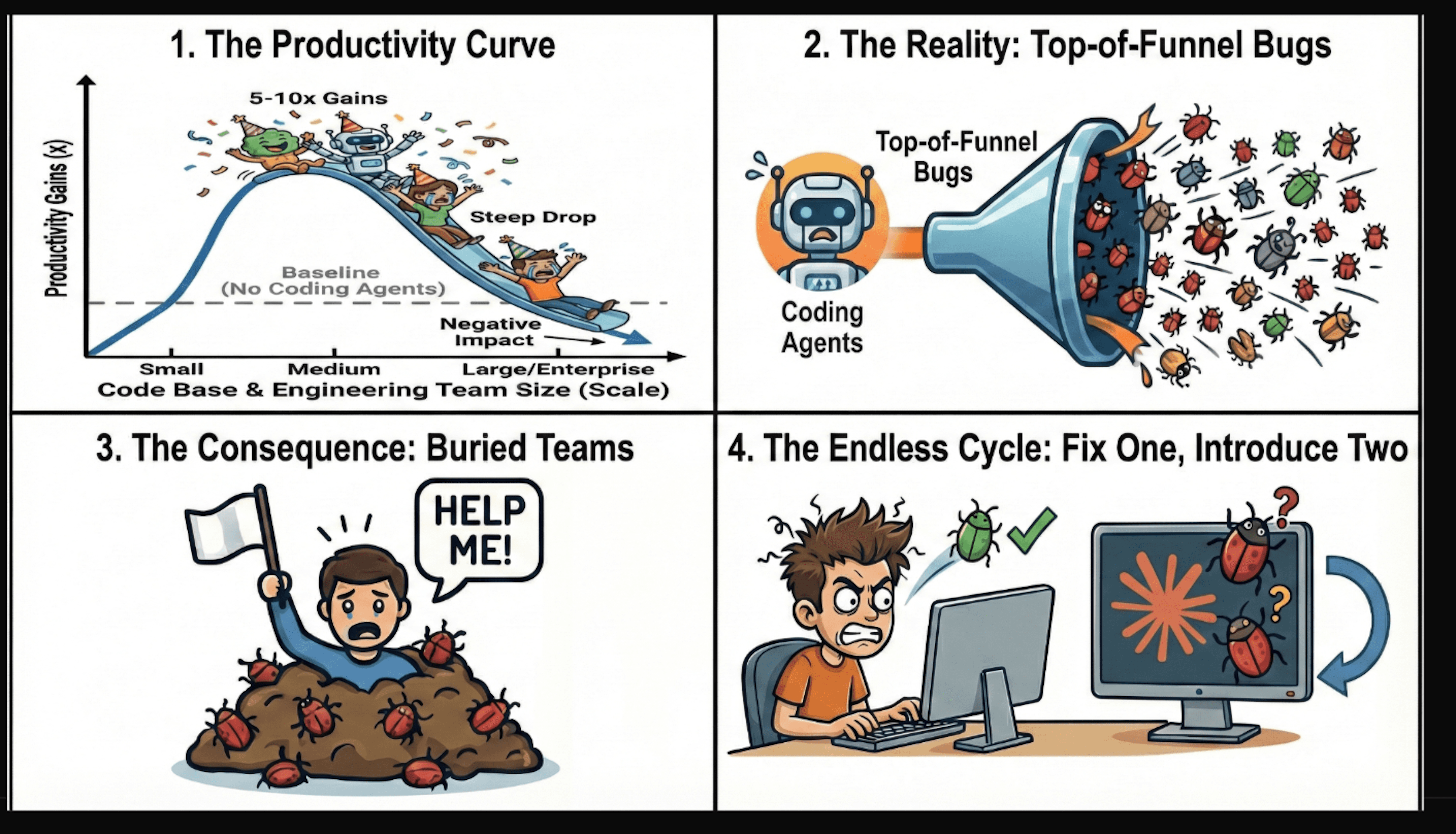 All four converged at the same point: code that passed linting, cleared unit tests, got approved in review, and broke something days later. Each late bug felt like a one-off. In aggregate, they were a pattern — and the pattern fed itself. Missing context produced wrong code. No feedback loop caught it before review. It merged. It broke. A developer fixed it manually, learning something that once again stayed in their head. Swapping models wouldn't have changed any of this. The gaps were in the process and tooling around them.