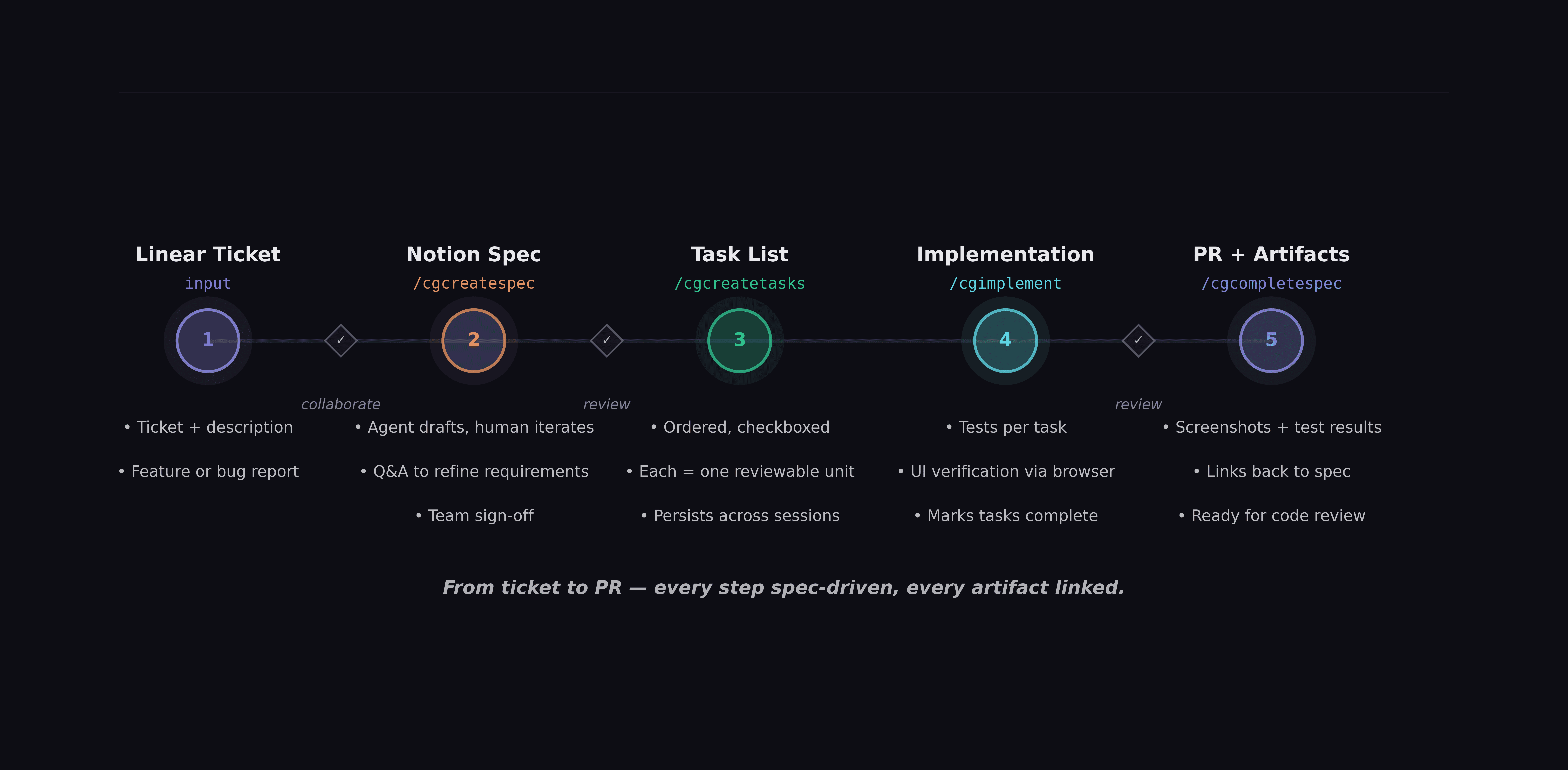 /cgcreatespec— Pulls a Linear ticket and drafts a Notion spec. The developer iterates on it interactively./cgcreatetasks— Breaks the spec into an ordered task list, each item scoped to a single reviewable unit./cgimplement— Works through tasks sequentially, running tests and verifying UI via browser agent at each step./cgcompletespec— Creates the PR with summary, screenshots, test results, and a link back to the spec./cgdevelop— Chains all four end-to-end./cgbugfix— Investigates root cause before writing a fix.Integrations