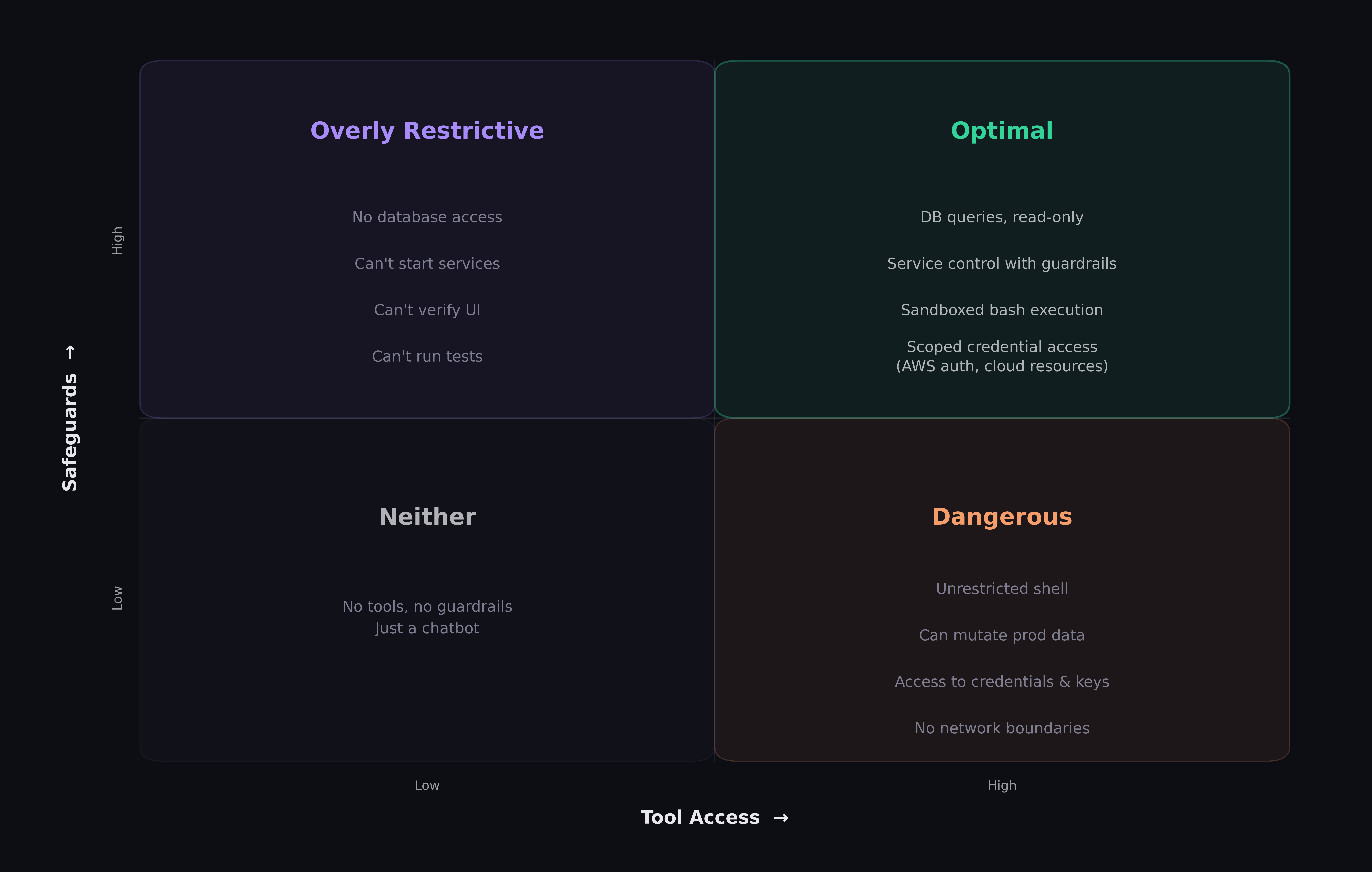 cg start server, an agent uses the same command. Same interface, same audit trail. Where agents differ is in having tighter guardrails — sandboxing, restricted network, read-only data — which is precisely what lets them operate with less hand-holding.Maximal safe autonomy — We didn't want to restrict what agents could do. The more autonomy they have, the more useful they are — that's where the productivity gains come from. But autonomy without guardrails is how you end up with an agent that has write access to production. Prompt injection, data exfiltration, credential misuse — agents face these risks regardless of model provider. Every new capability needed a corresponding constraint.