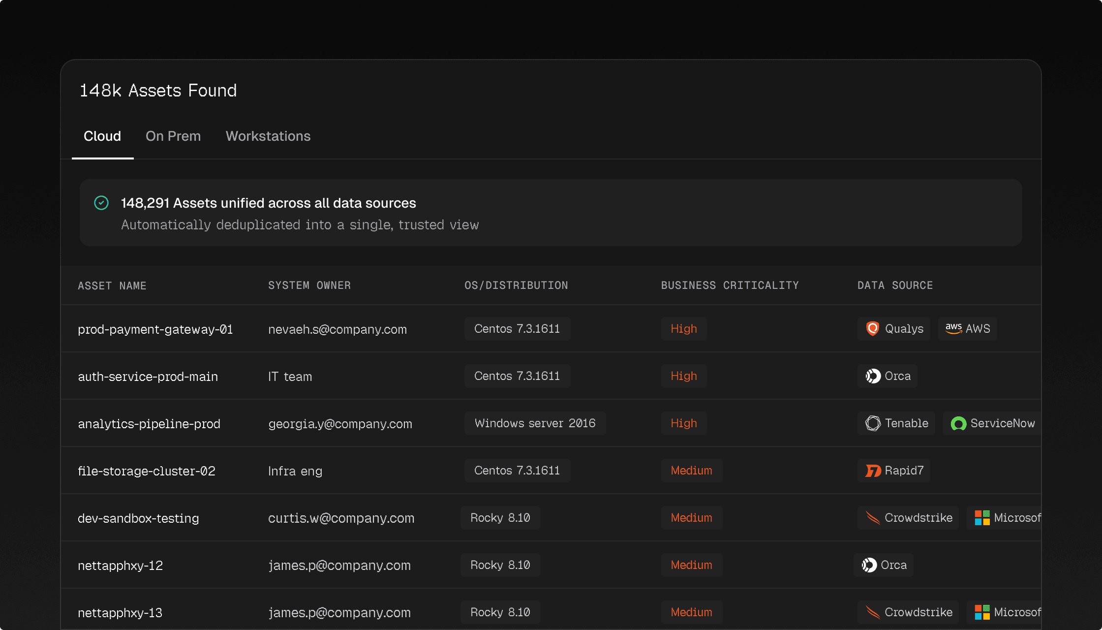 Ingest from vulnerability scanners, security tools, asset databases, and business applications.