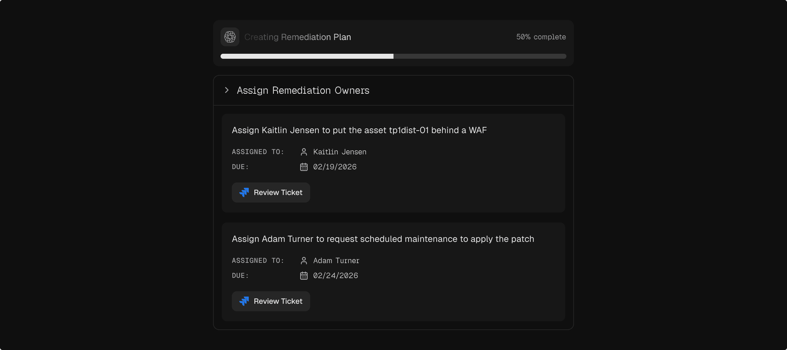 Cogent's AI agents create remediation plans and drive execution with the context teams need to act fast.