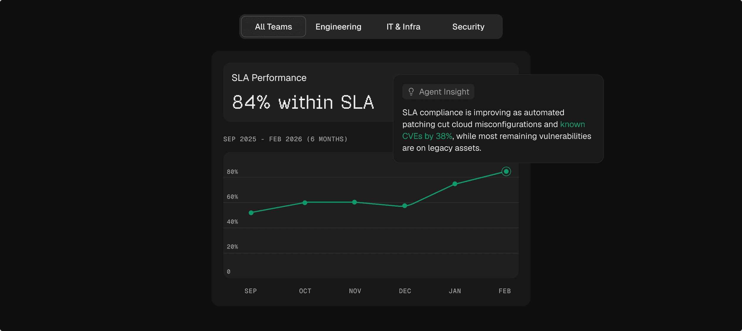 See how your vulnerability management program is performing: where you're meeting SLAs, where work is stalling, and whether risk is trending down.