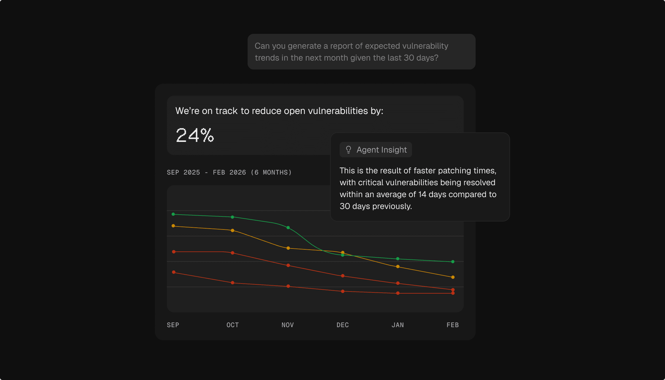 Track mean time to remediation, backlog aging, and risk trends over time. Understand whether your program is improving and where bottlenecks occur.